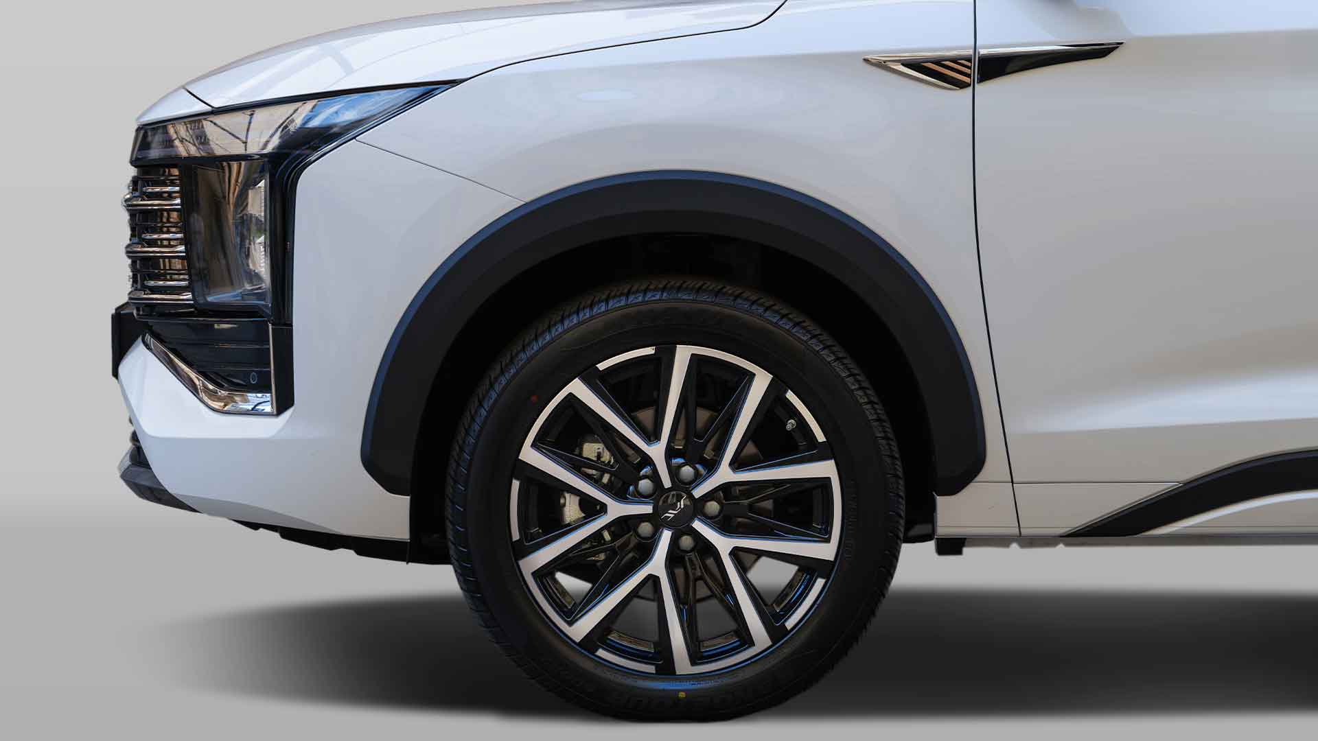 Koła w pojeździe wyróżniają się nowoczesnym designem, który podkreśla dynamiczny charakter auta. 19-calowe felgi aluminiowe nie tylko dodają elegancji, ale także zapewniają lepszą stabilność i komfort jazdy.